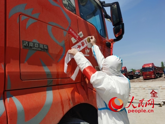 疫情防控人員對(duì)外來(lái)貨車進(jìn)行消殺。人民網(wǎng)記者 王繼亮攝