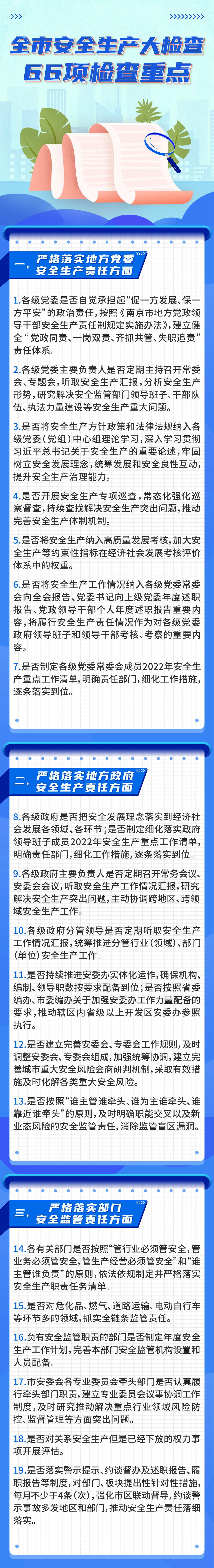 4月19日,南京市召開安全生產(chǎn)大檢查動員部署電視電話會議,即日起在全市范圍內(nèi)深入開展安全生產(chǎn)大檢查。全市將壓實各方責(zé)任,緊緊圍繞國務(wù)院安委會加強安全生產(chǎn)工作15條硬措施,深入查找、堅決整改貫徹落實中存在的突出問題、薄弱環(huán)節(jié)和短板弱項,列出66項檢查重點,推動安全生產(chǎn)大檢查落到實處。