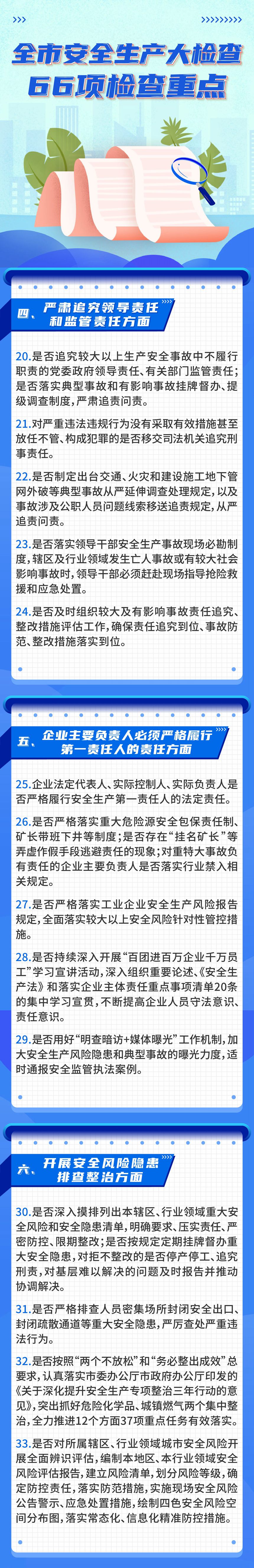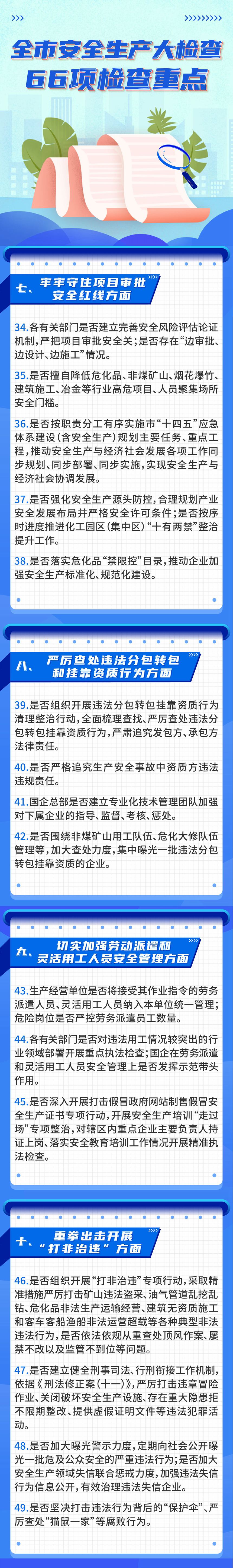 本次安全生產(chǎn)大檢查將分全面自查、專項檢查、綜合督導(dǎo)檢查、“回頭看”檢查等4個步驟,聚焦壓實黨政領(lǐng)導(dǎo)責(zé)任、部門監(jiān)管責(zé)任和企業(yè)主體責(zé)任“三個責(zé)任”落實、聚焦源頭治理城市安全風(fēng)險防控的老大難問題、聚焦推動重點領(lǐng)域“打非治違”常態(tài)化、聚焦重點工作一體推進(jìn)一抓到底,綜合施策,逐條逐項重點攻關(guān)突破。
