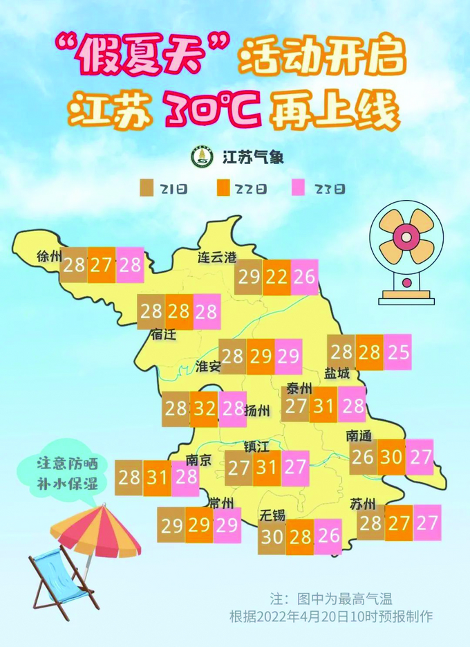 昨天南京的最高氣溫24.9℃,真是一個(gè)讓人想留住的剛剛好的溫度。南京今天最高氣溫升至27℃附近,明天起氣溫將再次沖擊30℃+,在夏天的邊緣瘋狂試探。預(yù)計(jì)明天夜里和后天白天南京云系增多,局部有陣雨,出門(mén)需帶上雨具。另外近期晝夜溫差較大,早晚還需適當(dāng)保暖。