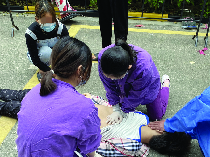 “我們這個(gè)采樣點(diǎn)的核酸檢測(cè)工作已經(jīng)快結(jié)束了,只有少部分居民還在排隊(duì),我和另外兩名護(hù)士正準(zhǔn)備脫防護(hù)服,就聽(tīng)到有人在大喊……”據(jù)邱珍珠介紹,當(dāng)天上午11點(diǎn)左右,核酸檢測(cè)工作已經(jīng)接近尾聲,她突然聽(tīng)到現(xiàn)場(chǎng)的保安在不遠(yuǎn)處大喊“誰(shuí)會(huì)急救?快來(lái)救人!”邱珍珠身邊的兩位護(hù)士立即放下手中的試劑盒飛奔過(guò)去,只見(jiàn)一名男子暈倒在地上。