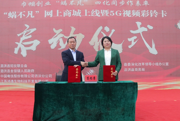 近日,江蘇省泗洪縣婦聯(lián)、改革辦、商務(wù)局、金鎖鎮(zhèn)人民政府和電信公司聯(lián)合舉辦“巾幗創(chuàng)業(yè)‘蝸不凡’,‘四化’同步作表率”現(xiàn)場(chǎng)活動(dòng),助力鄉(xiāng)村企業(yè)數(shù)字化復(fù)工復(fù)產(chǎn)!拔伈环病本W(wǎng)上商城正式上線,5G視頻彩鈴卡同步啟動(dòng),電信公司和“蝸不凡”品牌企業(yè)簽訂了“云改數(shù)轉(zhuǎn)”合作協(xié)議。