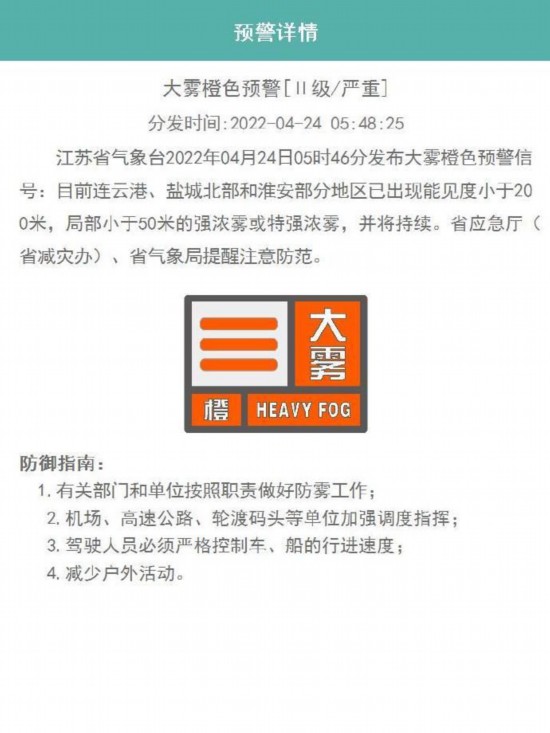 江蘇省氣象臺2022年04月24日05時46分發(fā)布大霧橙色預(yù)警信號:目前連云港、鹽城北部和淮安部分地區(qū)已出現(xiàn)能見度小于200米,局部小于50米的強(qiáng)濃霧或特強(qiáng)濃霧,并將持續(xù)。省應(yīng)急廳(省減災(zāi)辦)、省氣象局提醒注意防范。