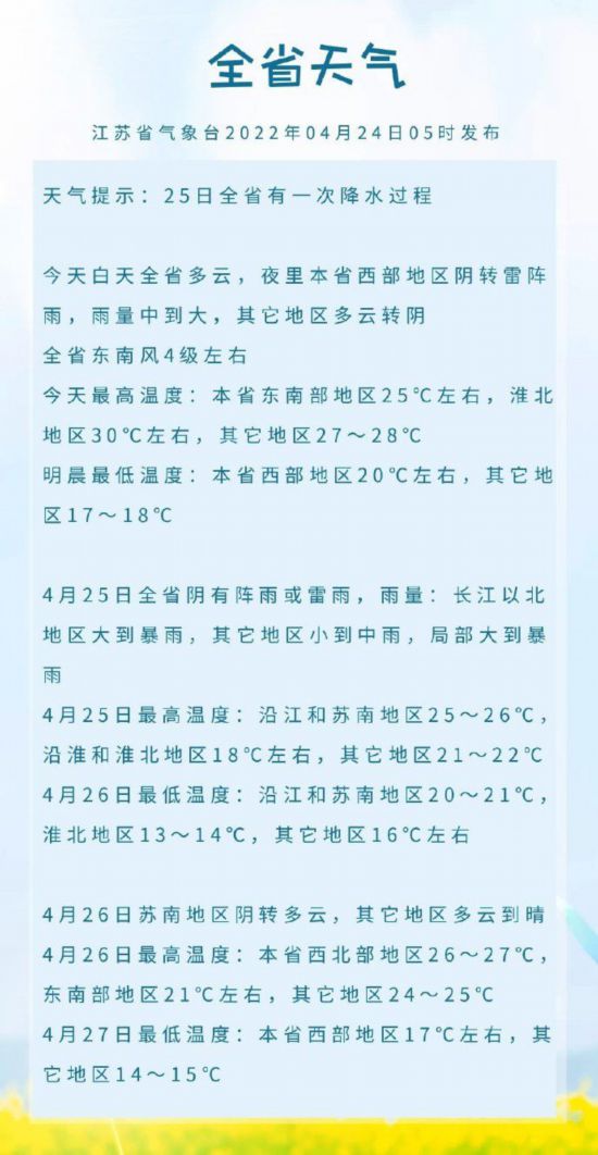 24日夜里江蘇強(qiáng)降水大風(fēng)齊上陣,25日全省有一次降水過程。今天白天全省多云,夜里本省西部地區(qū)陰轉(zhuǎn)雷陣雨,雨量中到大,其它地區(qū)多云轉(zhuǎn)陰,全省東南風(fēng)4級左右,今天最高溫度:本省東南部地區(qū)25℃左右,淮北地區(qū)30℃左右,其它地區(qū)27~28℃,明晨最低溫度:本省西部地區(qū)20℃左右,其它地區(qū)17~18℃。
