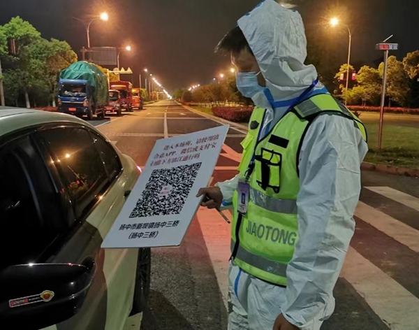 黨員志愿者在交通查驗崗查看來揚人員“雙碼”。揚中煙草供圖