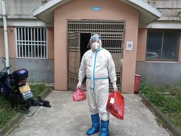 黨員志愿者化身“大白”在封控區(qū)為隔離人員服務。揚中煙草供圖