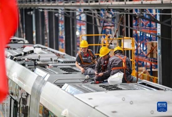 4月24日,在位于四川省宜賓市三江新區(qū)的中車鐵投軌道交通產(chǎn)業(yè)基地生產(chǎn)車間,工人在生產(chǎn)安裝智軌電車(智能軌道快運(yùn)系統(tǒng))。已有多個(gè)國家和地區(qū)就智軌項(xiàng)目進(jìn)行洽談,希望引進(jìn)該項(xiàng)目。