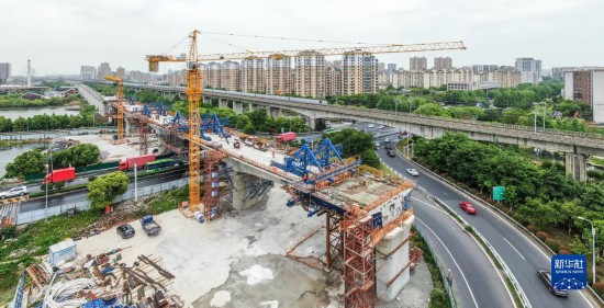 這是4月28日拍攝的江蘇南沿江城際鐵路南京段站前1標(biāo)跨上坊互通連續(xù)梁施工現(xiàn)場(無人機(jī)照片)。
