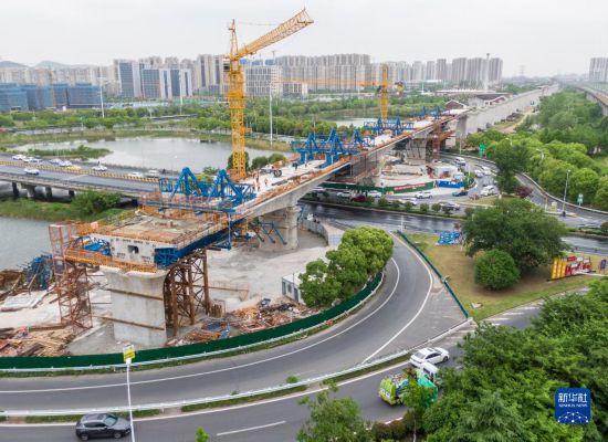 這是4月28日拍攝的江蘇南沿江城際鐵路南京段站前1標(biāo)跨上坊互通連續(xù)梁施工現(xiàn)場(chǎng)(無人機(jī)照片)。