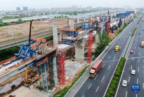 這是4月28日拍攝的江蘇南沿江城際鐵路南京段跨西氣東輸連續(xù)梁施工現(xiàn)場(無人機照片)。