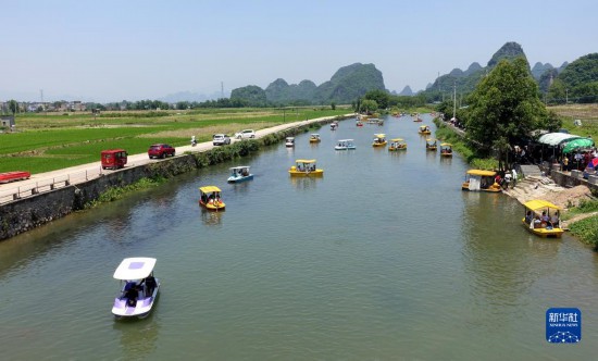 5月3日,游人在廣西賀州市平桂區(qū)沙田鎮(zhèn)泛舟“小涼河”。