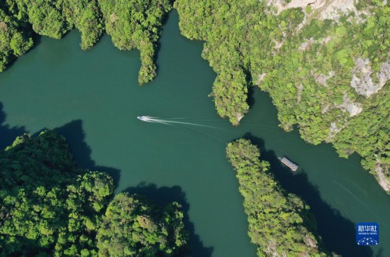5月3日,游人在湖南張家界市武陵源區(qū)寶峰湖景區(qū)乘船游覽(無人機(jī)照片)。
