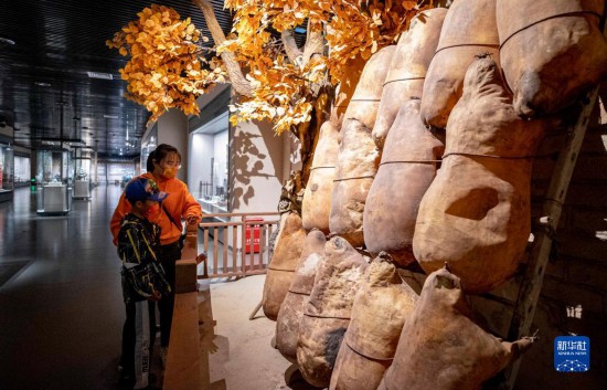 5月3日,家長帶著孩子在寧夏博物館參觀“天下黃河富寧夏”寧夏民俗陳列展。