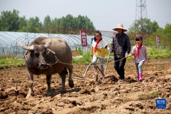 5月3日,安徽省黃山市屯溪大位小學(xué)學(xué)生在農(nóng)耕文化體驗(yàn)式社會(huì)綜合實(shí)踐活動(dòng)中體驗(yàn)耕牛犁田。
