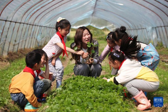 5月3日,安徽省黃山市屯溪大位小學(xué)老師在農(nóng)耕文化體驗(yàn)式社會(huì)綜合實(shí)踐活動(dòng)中為學(xué)生講解秧苗培育。
