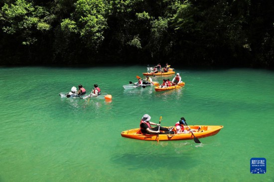 5月3日,游人在湖北省鶴峰縣容美鎮(zhèn)屏山村屏山旅游景區(qū)坐船游玩。