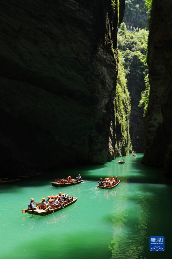 5月3日,游人在湖北省鶴峰縣容美鎮(zhèn)屏山村屏山旅游景區(qū)坐船游玩。