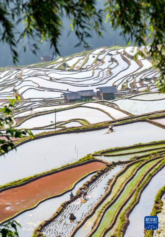 5月5日,村民在貴州省黔東南苗族侗族自治州從江縣加榜鄉(xiāng)黨扭村的梯田中勞作。