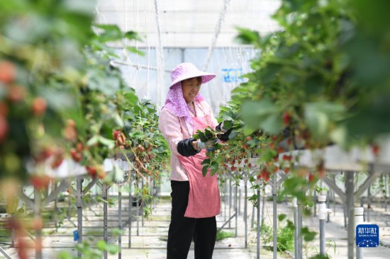 5月5日,在位于福州市的一家現(xiàn)代農(nóng)業(yè)示范園內(nèi),工人對(duì)設(shè)施草莓進(jìn)行植株整理。
