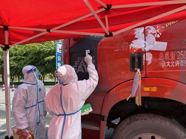 由于昆山市疫情管控,貨車入城前需根據(jù)司乘人員行程軌跡,申領(lǐng)“橙、藍(lán)、綠”三色標(biāo)志,分別對(duì)應(yīng)三種情況:途徑外地中高風(fēng)險(xiǎn)地區(qū)、行程卡帶星的;途經(jīng)市外全域低風(fēng)險(xiǎn)地區(qū)、行程卡不帶星的;僅在市域范圍內(nèi)通行的貨運(yùn)車輛。交通卡口防疫人員根據(jù)三色標(biāo)志對(duì)貨車采取不同防疫措施,分流引導(dǎo)、快速放行。