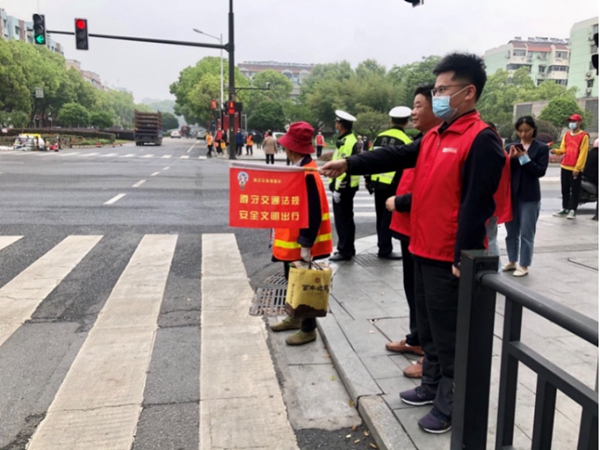 5月15日,在車輛、人流密集的浦口區(qū)鳳凰大街,“金葉先鋒”志愿者們走上街頭,協(xié)助開展文明交通執(zhí)勤。浦口煙草供圖