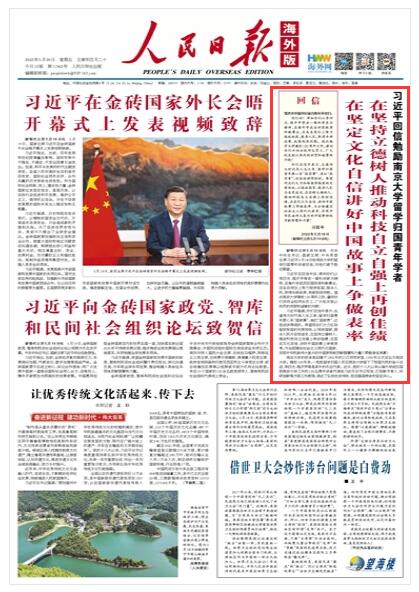 人民日?qǐng)?bào)海外版:習(xí)近平回信勉勵(lì)南京大學(xué)留學(xué)歸國(guó)青年學(xué)者
