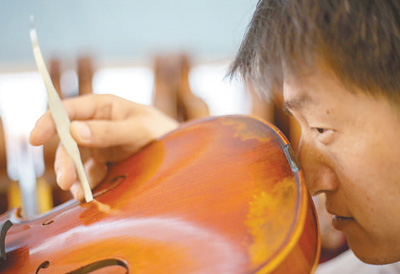 徐小峰對(duì)小提琴白坯進(jìn)行油漆前處理。湯德宏攝(影像中國(guó))