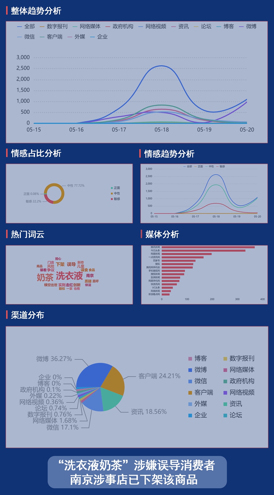 輿情概況:新近,一款可以喝的“洗衣液奶茶”火了,這款洗衣液造型的奶茶最早由南京一家泰式餐飲店推出。隨后,蘇州、珠海等地也有類似外形的產品出現。獨特的外包裝為它帶來了嘗鮮的顧客,但也招來不少消費者質疑。有人擔心這類產品會誤導兒童,把真正的洗衣液當作飲品食用。5月17日,南京有關泰式餐飲門店已下架洗衣液奶茶商品。