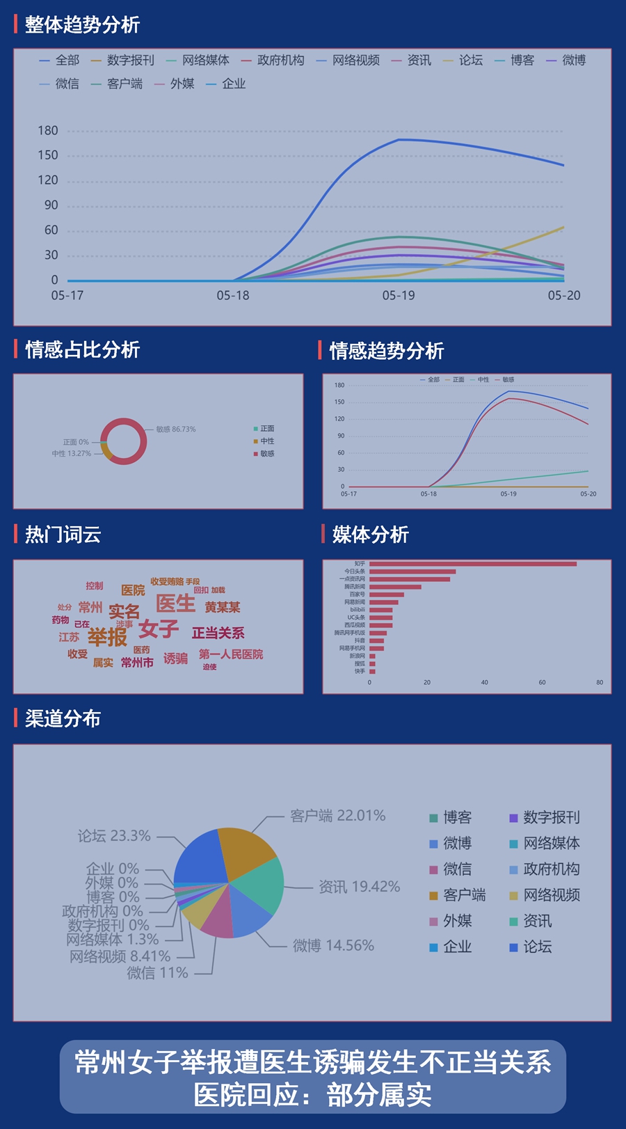 輿情概況:近日,一女子通過短視頻平臺實名舉報常州市第一人民醫(yī)院神經內科醫(yī)生黃某某,稱其利用誘騙和藥物控制等手段,迫使兩人長期保持不正當關系,并表示黃某多次炫耀自己收受醫(yī)藥代表賄賂和病人紅包的情況。隨后,該醫(yī)院通過當地論壇回應稱,該問題經核查部分屬實,已于2021年9月6日依據規(guī)定給予相關人員黨紀處分。