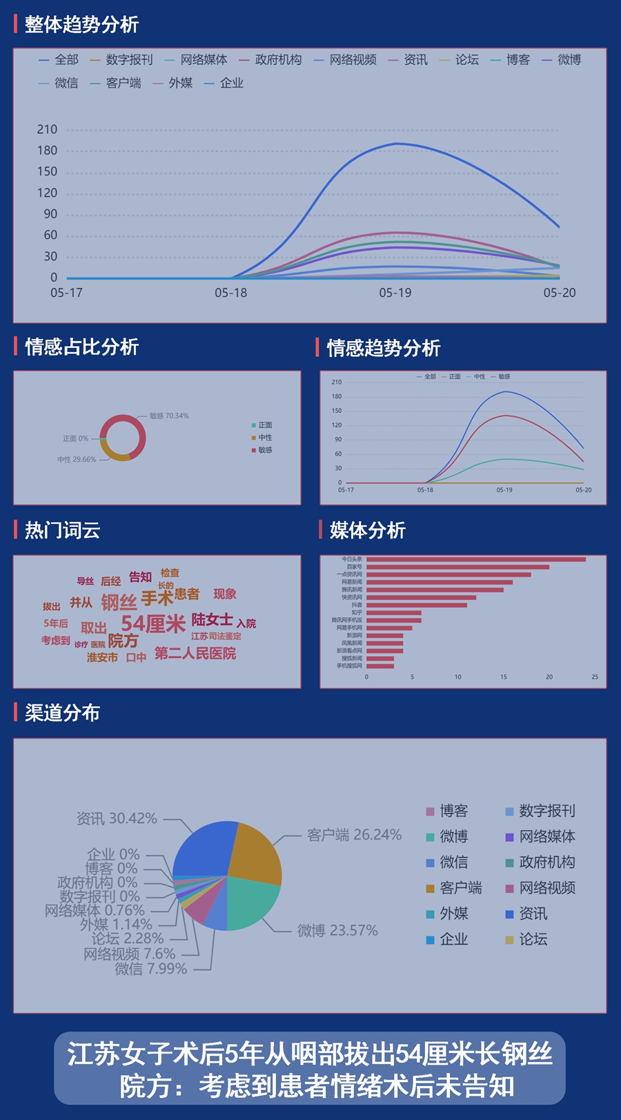 輿情概況:2016年11月2日,淮安的陸女士因蛛網膜下腔出血在淮安市第二人民醫(yī)院做了手術,手術中有微導絲殘留體內,醫(yī)院知情但未告知病人。手術后5年,陸女士出現了咳血現象,并從口中取出一根54厘米長的鋼絲,后經入院檢查發(fā)現血管內還殘留有另外一段鋼絲,并伴有腦梗死。院方表示,手術后就已經發(fā)現有鋼絲殘留體內,但是考慮到患者情緒,沒有告知。經江蘇省人民醫(yī)院司法鑒定所鑒定,淮安市第二人民醫(yī)院對陸女士的診療行為存在過錯;颊叻较Mt(yī)院賠償手術之后所花的醫(yī)療費及2萬元的精神損失費,院方表示走司法途徑解決。