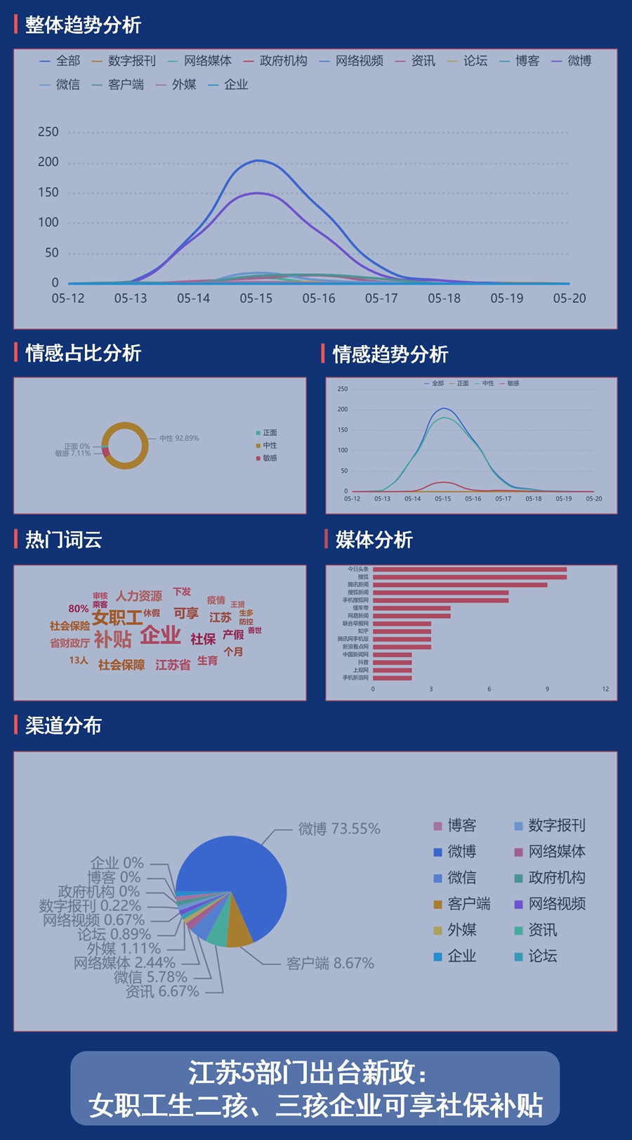 輿情概況:5月12日,江蘇省人社廳、省財政廳、省衛(wèi)健委、省醫(yī)保局、省政務辦等5部門下發(fā)《關于產假期間企業(yè)社會保險補貼有關事項的通知》,明確女職工生育二孩、三孩的,為其在產假期間繳納社會保險費的企業(yè)可享社會保險補貼。