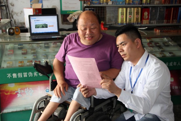 客戶經(jīng)理幫困難零售戶講解政策。丹陽煙草供圖