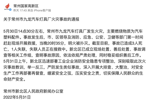 通報(bào)稱,此次火災(zāi)事故主要燃燒物質(zhì)為汽車塑料配件。5月30日20時(shí)35分,明火被撲滅。截至目前,事故已造成3人死亡,1人失聯(lián),失聯(lián)人員正在搜救中。新北區(qū)已成立現(xiàn)場(chǎng)處置、善后處置、事故調(diào)查等相關(guān)工作組,查明事故原因,依法依規(guī)嚴(yán)肅處理,同時(shí)穩(wěn)妥組織善后工作。