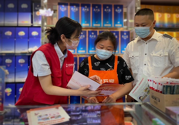 圖為志愿者和稽查員為零售戶普及民法典知識。宿遷煙草供圖
