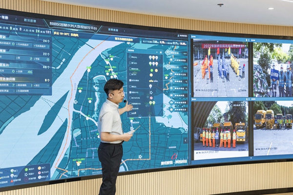工作人員介紹新亮相的鼓樓智慧防汛模塊。朱宇晨攝