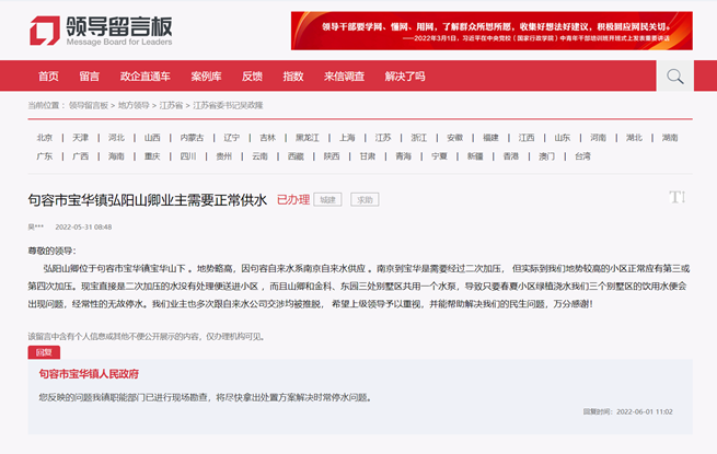 在兩人留言的第二天,句容市寶華鎮(zhèn)政府做出回應(yīng),表示已安排職能部門進(jìn)行現(xiàn)場(chǎng)勘查,將盡快拿出處置方案解決停水問題。