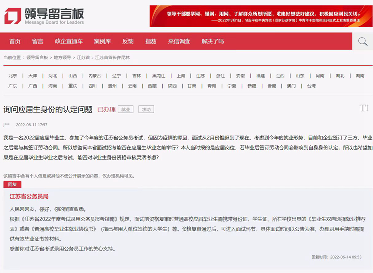 另一位留言考生小赫說,留言后很快接到江蘇省公務(wù)員局工作人員的回訪電話,“告訴我應(yīng)屆生身份認(rèn)定以報名時間為準(zhǔn),后續(xù)不影響身份認(rèn)定!