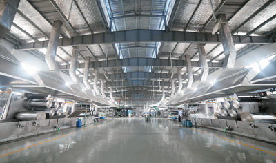“目前,閃染免水洗工藝主要適用于滌綸織物;工藝命名中‘閃’字,主要是強(qiáng)調(diào)生產(chǎn)效率及出布速度的顯著提升?!睂O素梅介紹,以單臺(tái)設(shè)備生產(chǎn)量計(jì)算,傳統(tǒng)染缸設(shè)備一天產(chǎn)量4噸,而閃染生產(chǎn)線(xiàn)一天可生產(chǎn)25噸?!伴W染工藝已實(shí)現(xiàn)產(chǎn)業(yè)化生產(chǎn),公司共有4條生產(chǎn)線(xiàn),日產(chǎn)布料超過(guò)100噸。同時(shí),我們的生產(chǎn)成本也大為降低,過(guò)去實(shí)現(xiàn)這樣的產(chǎn)量至少需要用工400人,現(xiàn)在只需100多人。從環(huán)保角度看,以前每噸廢水中化學(xué)需氧量高達(dá)兩三千,現(xiàn)在只有在清洗機(jī)器、深色布的處理上需要用一些水,用水量大大減少,化學(xué)需氧量值也降到了幾百,處理起來(lái)更加容易,污染更小了。”