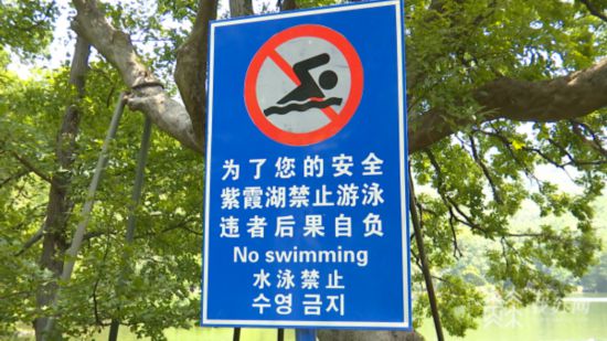 同樣,在南京花神湖旁,"水情復(fù)雜,禁止游泳"的標語隨處可見,但來這游泳的人還是絡(luò)繹不絕。一些人甚至連浮力設(shè)備都不帶。