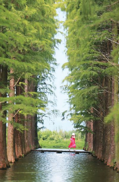 游客在江蘇省揚(yáng)州市淥洋湖濕地公園“水上森林”休閑避暑。孟德龍攝(人民圖片)