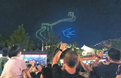 位于北京近郊的古北水鎮(zhèn)成為周邊游客避暑休閑的一大選擇,圖為游客夜游古北水鎮(zhèn),觀看景區(qū)內(nèi)的無人機(jī)表演。本報(bào)記者 尹 婕攝