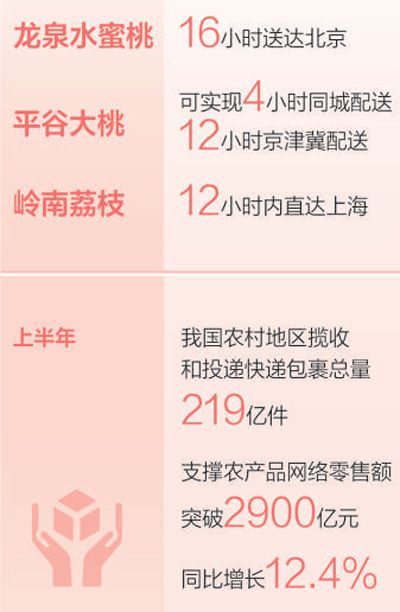 龍泉水蜜桃,能在16小時送達北京;平谷大桃,能實現(xiàn)4小時同城配送,12小時京津冀配送;嶺南荔枝,12小時內(nèi)直達上?!衲晟习肽辏覈r(nóng)村地區(qū)攬收和投遞快遞包裹總量219億件,支撐農(nóng)產(chǎn)品網(wǎng)絡(luò)零售額突破2900億元,同比增長12.4%。越來越多的農(nóng)特產(chǎn)品通過快遞網(wǎng)絡(luò)走出鄉(xiāng)村,為農(nóng)民增收,給消費者帶來驚喜。