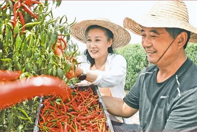 河南省開封市尉氏縣政協(xié)委員郭彥平(左)在十八里鎮(zhèn)武家村永獻種植合作社了解辣椒外銷情況。李新義攝(人民視覺)