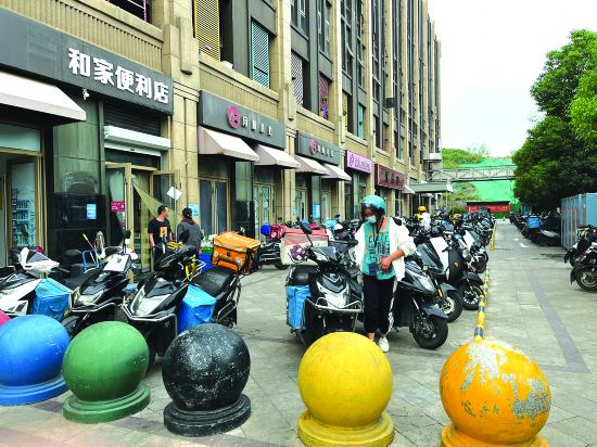 9月3日下午,記者來(lái)到南京市雨花臺(tái)區(qū)中南錦苑小區(qū)大門前的社區(qū)商業(yè)街,剛進(jìn)入商業(yè)街區(qū)的入口,便看到二層一側(cè),停滿了3排電動(dòng)車,不斷有外賣騎手在此停車,或是拎著滿手的外賣前去取車。偌大的商業(yè)街只有忙碌的外賣店家和騎手來(lái)來(lái)往往。
