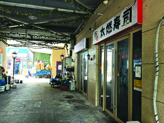 該商業(yè)街區(qū)分為兩層,二層的空置商鋪較多。記者來(lái)到一層發(fā)現(xiàn),基本上所有門開(kāi)著的商鋪都是些沒(méi)有堂食位置的外賣店鋪,大部分門口都張貼著“看號(hào)拿餐自取”的標(biāo)語(yǔ)。其中一些外賣店鋪的門半虛掩著,時(shí)不時(shí)有拿著毛巾、端著盆的人來(lái)回進(jìn)出。在這些外賣店鋪中還夾雜著一些可以堂食的小飯館和便利店。一層的路面上、許多外賣店鋪大門及兩側(cè),沾滿了成片的黑色污垢,使得原本就很難被陽(yáng)光照射到的一層街區(qū)更顯昏暗。