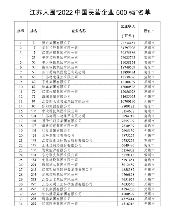 “2022民營企業(yè)500強(qiáng)”榜單發(fā)布 江蘇92家企業(yè)入圍
