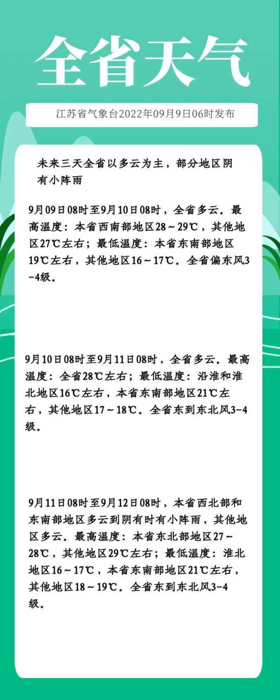 10日(中秋節(jié)):白天全省陰,夜里沿江和蘇南地區(qū)陰到多云,其他地區(qū)多云到晴。全省18~29℃。