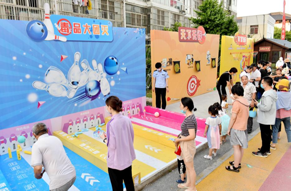 “小朋友,恭喜你擊倒了所有的‘毒’保齡球,你看看,這些像糖果的藥丸就是毒品,如果你遇到了這樣的東西,一定要立即向爸爸媽媽說,我們一起擊敗它?!痹凇岸酒?團滅——保齡球”游戲現(xiàn)場,市公安局民警正向孩子們普及禁毒知識。