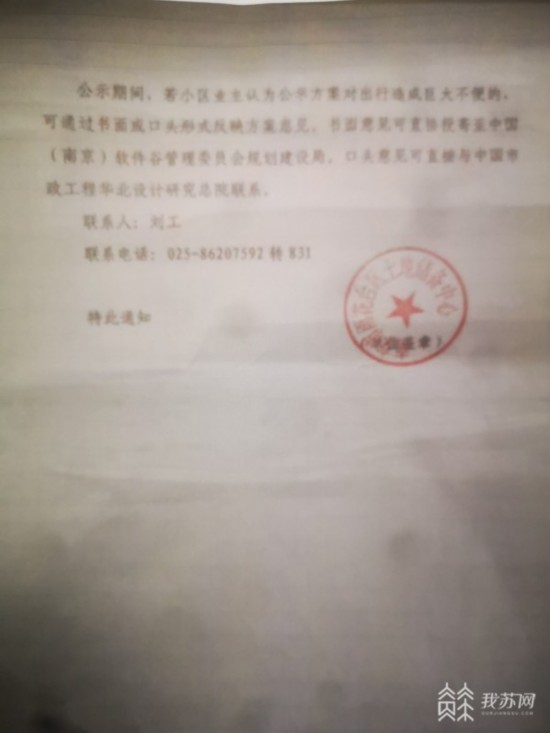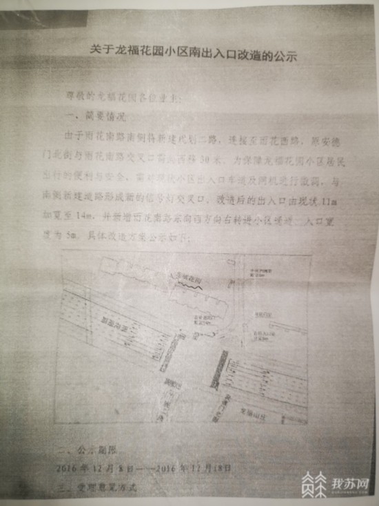 有居民向記者出示了一份《關(guān)于龍福花園小區(qū)南出入口改造的公示》,公示上的改造方案是2016年12月份由南京市雨花臺區(qū)土地儲備中心出具的,按照公示的內(nèi)容,新開南北向道路,確實(shí)要對龍福花園小區(qū)門口的紅綠燈進(jìn)行改動,但龍?;▓@小區(qū)的出入仍是卡在兩條斑馬線中間,并未在道路中間設(shè)置護(hù)欄,公示內(nèi)容和實(shí)際施工情況并不一致。