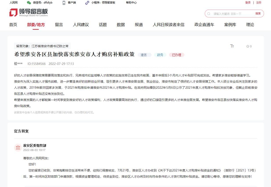 “非常感謝,工作人員第一時間就聯(lián)系了我,并跟我溝通解釋了人才購房補(bǔ)貼資金發(fā)放時間?!?月3日,李先生在人民網(wǎng)“領(lǐng)導(dǎo)留言板”上如是評價。